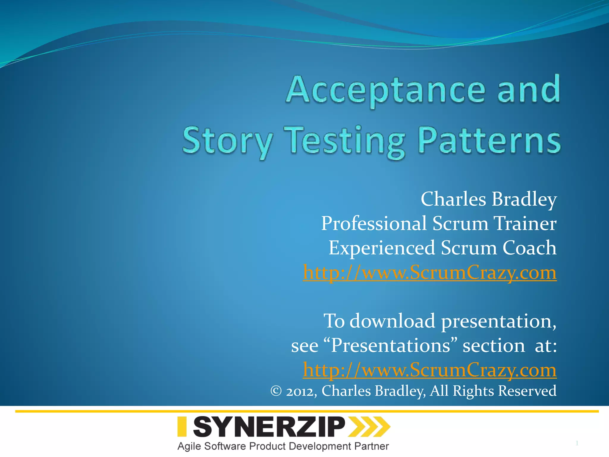 The document covers the principles and techniques of story testing patterns in Agile Scrum development, emphasizing the importance of upfront test identification and effective communication through user stories. It includes various patterns for writing tests, such as 'test that...', 'given/when/then', and specification by example, along with advice on optimizing documentation and collaboration with product owners. Overall, it highlights that story tests should focus on validating expected behavior through well-defined criteria rather than serving purely as documentation.
