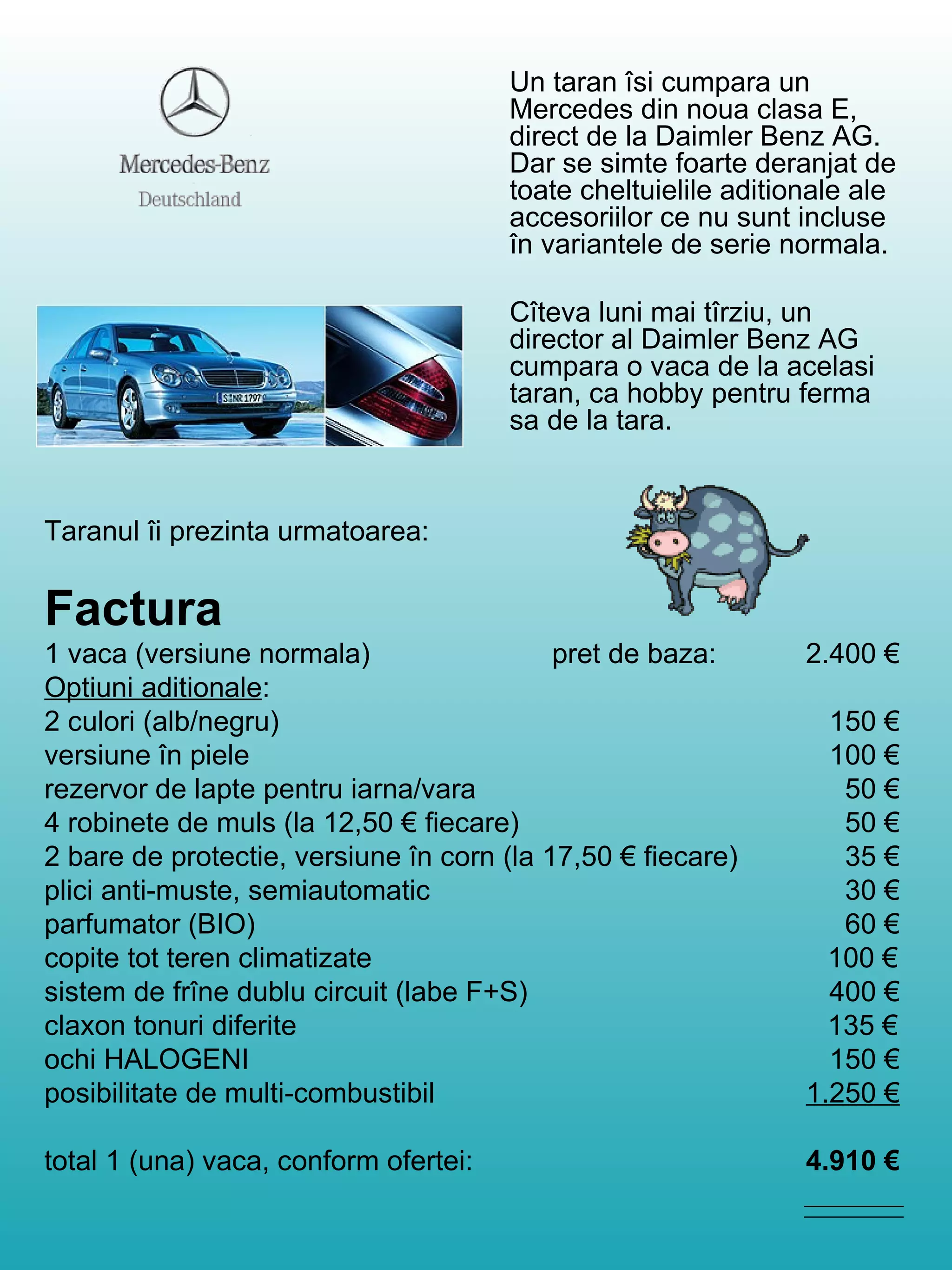Un țăran oferă o vacă la prețul de 4.910 €, inclusiv opțiuni și accesorii diverse, care cresc costul de bază. Un țăran, după ce a achiziționat un Mercedes E-Class, se plânge de cheltuielile suplimentare pentru accesorii. Într-un incident ulterior, un director de la Daimler Benz cumpără o vacă de la țăran ca hobby pentru ferma sa.