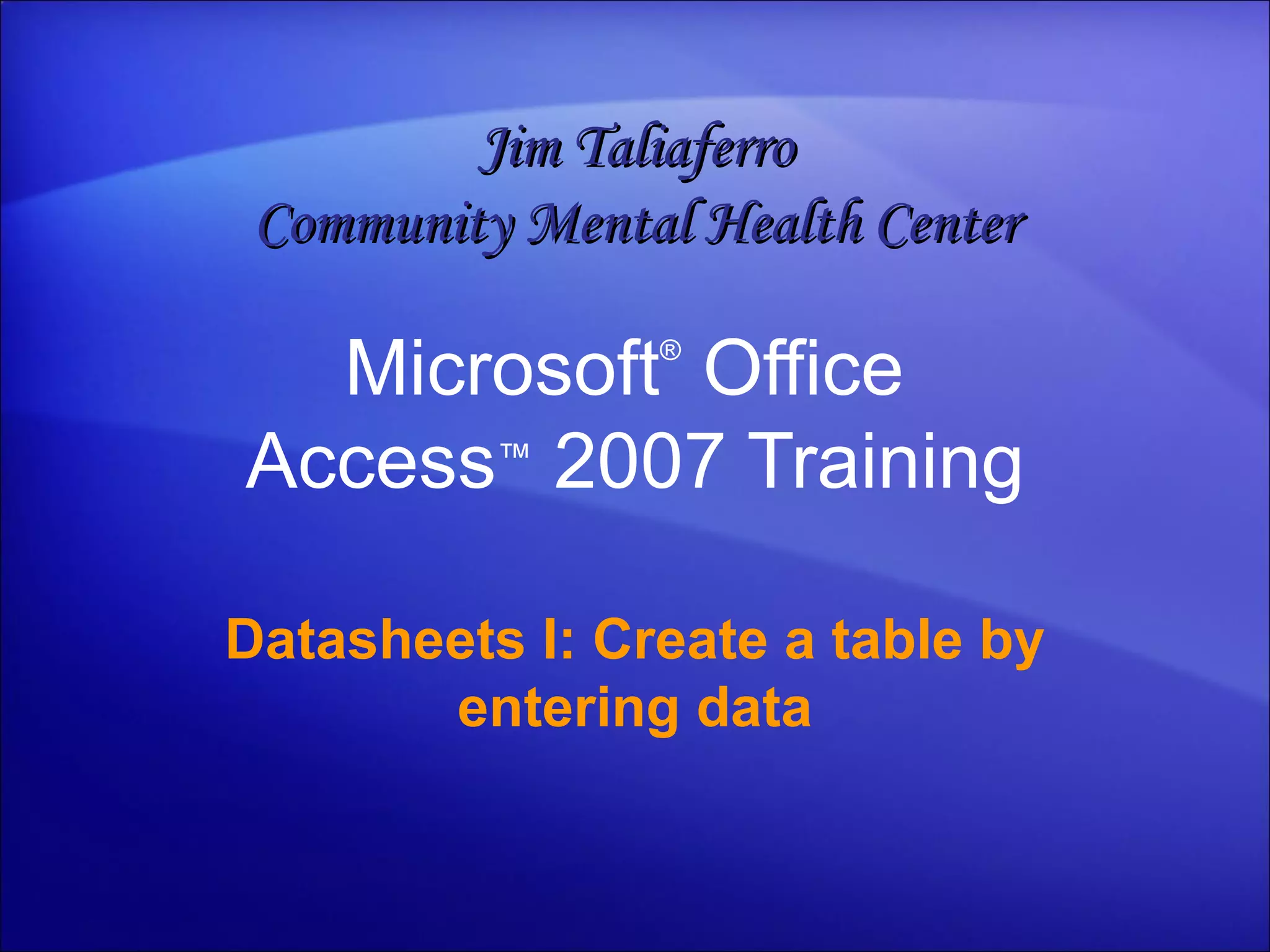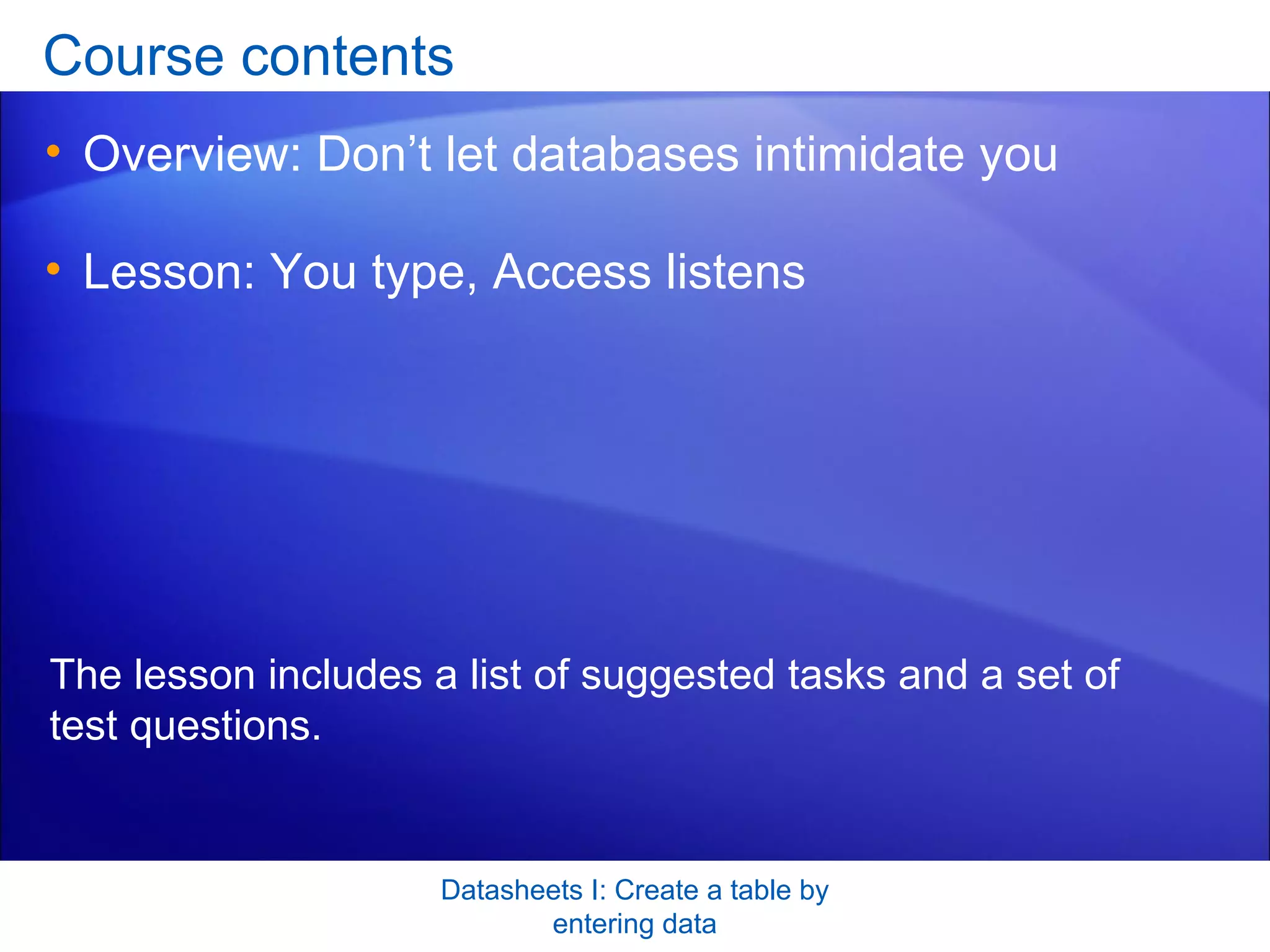 This document provides a training overview on creating and populating a table in Microsoft Access by entering data. It discusses creating a new blank database and table, entering data into the table's fields, setting field names and data types, and changing data types. Care is needed when changing data types to avoid losing existing data. The document includes practice suggestions and test questions.