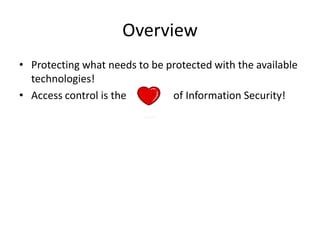 This document provides an overview of access control, including identification, authentication, and authorization. It discusses different types of access controls like administrative, technical, and physical controls. It also covers specific access control methods like passwords, biometrics, smart cards, and tokens. Identification establishes a subject's identity, while authentication proves the identity. Authorization then controls the subject's access to resources based on their proven identity. The document categorizes access controls as preventive, detective, corrective, recovery, compensating, and directive. It provides examples of different administrative, technical, and physical controls that fall into each category.