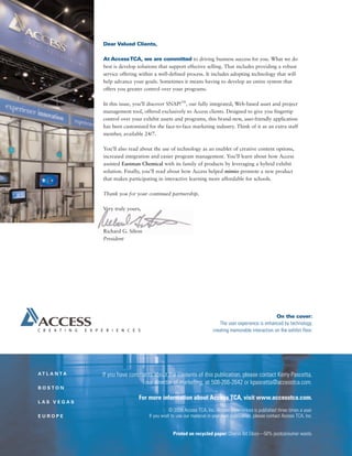 The document discusses how technology has enabled progress in experiential marketing. It profiles three companies - Eastman Chemical, mimio, and Access TCA. For Eastman Chemical, Access TCA helped promote its umbrella brand and family of products through a hybrid exhibit solution that was flexible, reconfigurable, and lightweight. For mimio, Access TCA helped promote a new affordable interactive learning product for schools. Access TCA also introduced its new web-based asset and project management tool called SNAP! which gives clients control over their exhibit assets and programs from any computer.