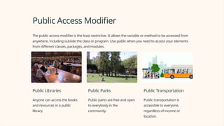 In Java, access modifiers are an essential part of coding best practices. Each modifier has a unique purpose and usage. It's essential to use them properly to ensure the security and maintainability of your code. In summary, public is the least restrictive while default is the most restrictive. Private restricts access to the same class while protected restricts access to the same package and subclass. Keep in mind that proper encapsulation means hiding implementation details and exposing functionality through public methods.