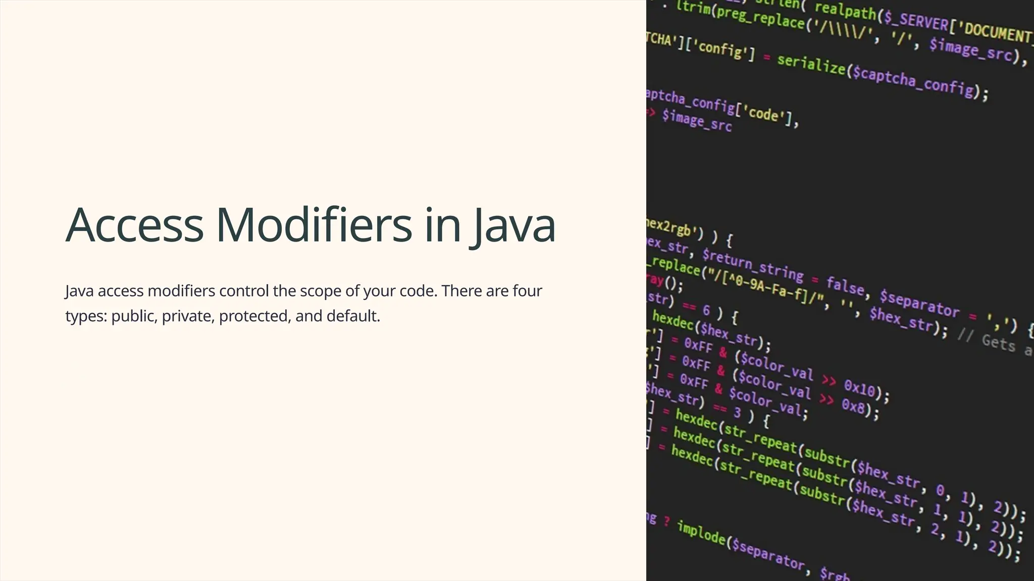 In Java, access modifiers are an essential part of coding best practices. Each modifier has a unique purpose and usage. It's essential to use them properly to ensure the security and maintainability of your code. In summary, public is the least restrictive while default is the most restrictive. Private restricts access to the same class while protected restricts access to the same package and subclass. Keep in mind that proper encapsulation means hiding implementation details and exposing functionality through public methods.