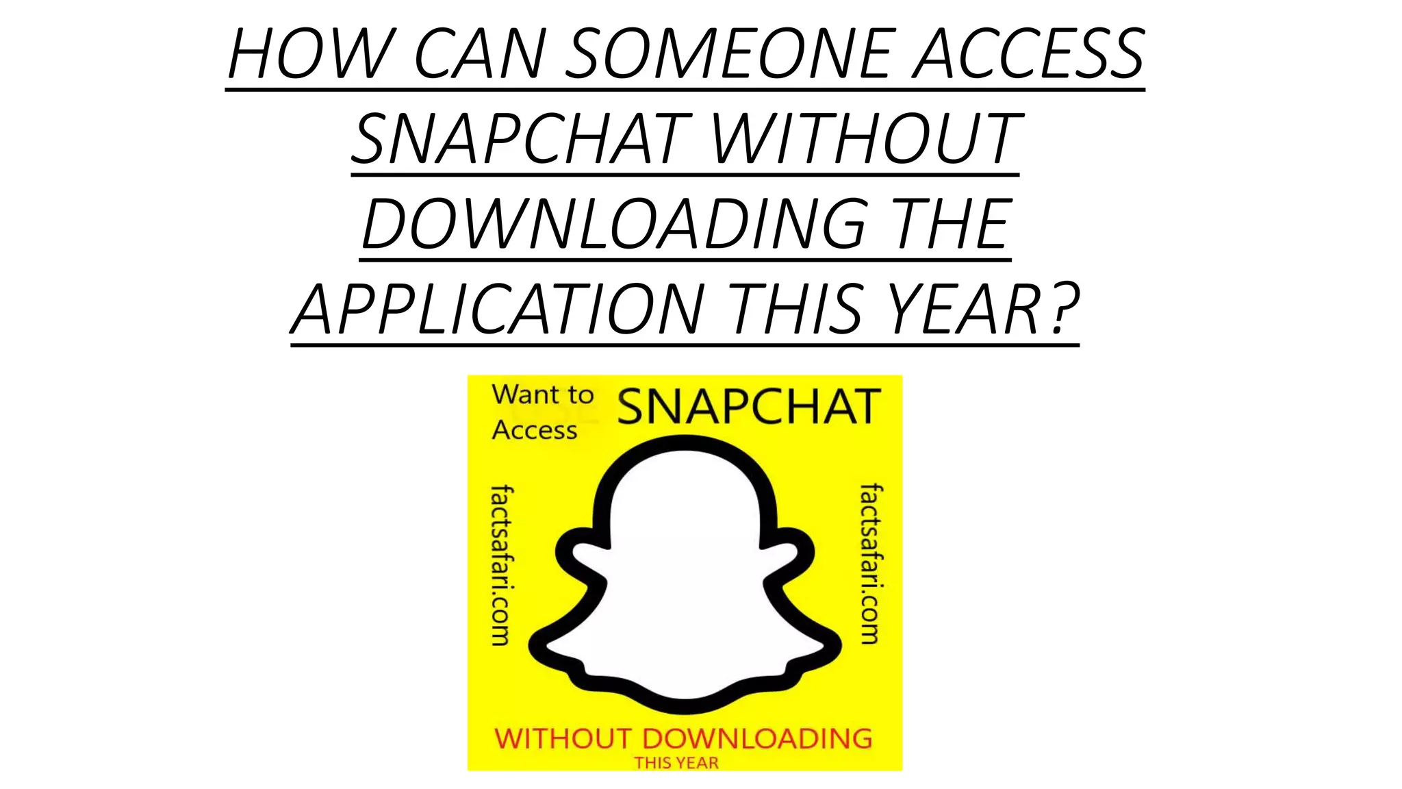 Snapchat can be accessed online without downloading the app through a few methods. The Snapchat website allows users to edit their profile but not interact with other users. Manymo and KO Player are Android emulators that allow accessing Snapchat and other apps from a computer by emulating a mobile device. While these emulators provide online Snapchat access, full Snapchat functionality requires installing the app on a mobile device.