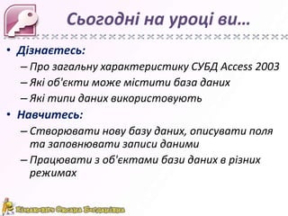 • Система управліннябазами даних Access 2003 це реляційна СУБД, яка належить до файлсерверних СУБД і передбачає роботу з