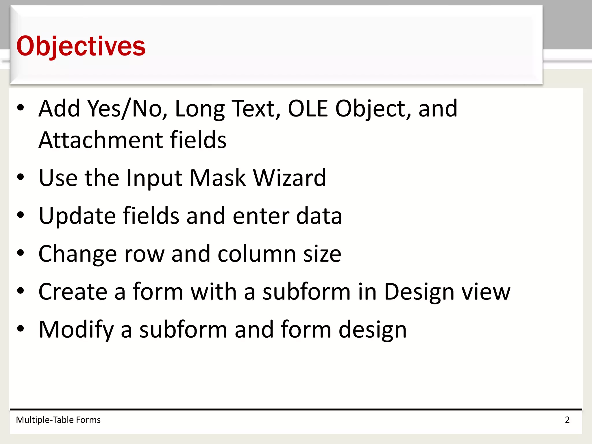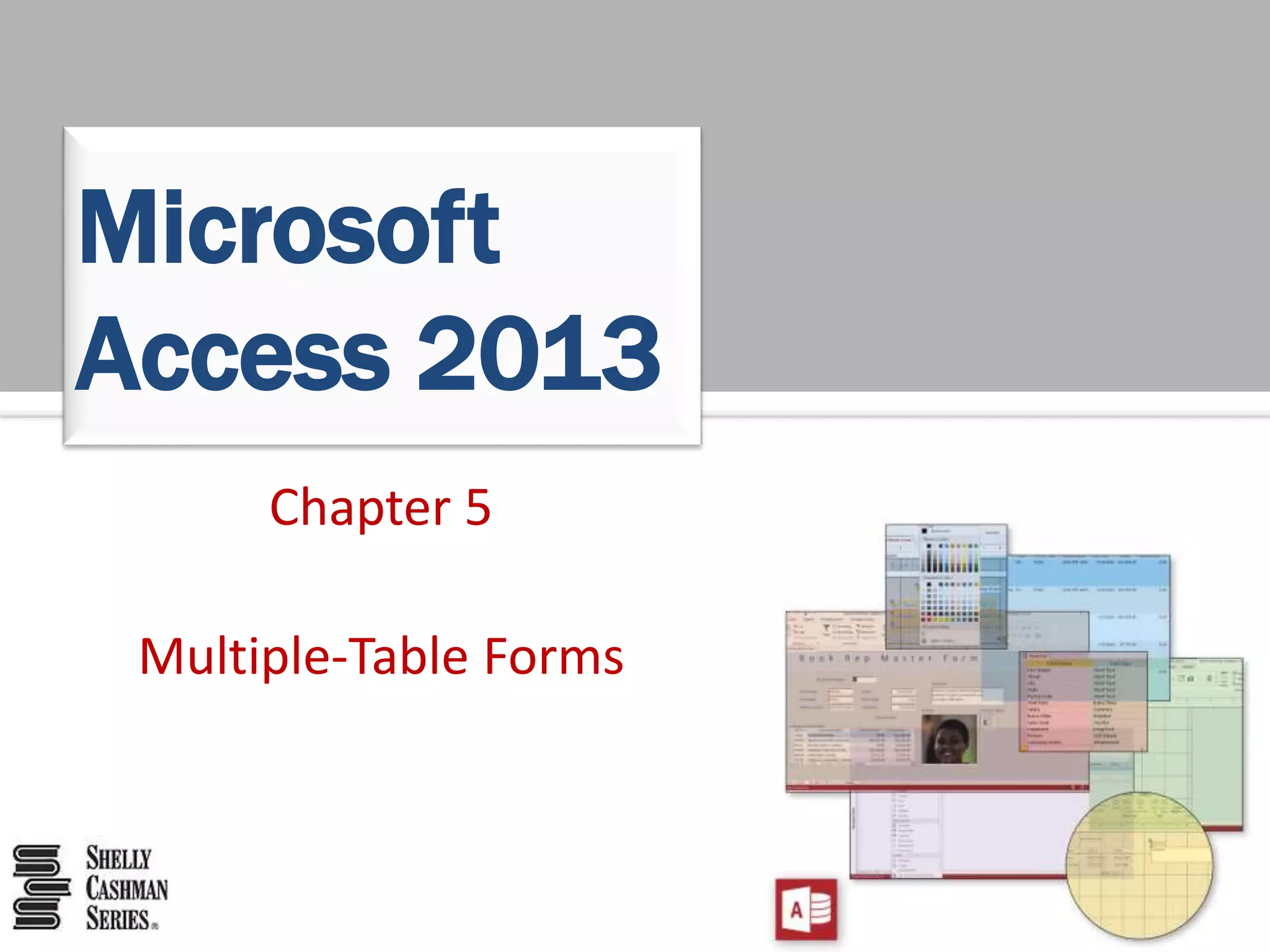 This chapter discusses working with multiple-table forms in Microsoft Access 2013. It covers how to add different field types like Yes/No, Long Text and OLE Object fields to tables and enter data in them. It also discusses how to create forms and subforms in Design view, modify their design, view object dependencies and use special field types in queries. The key objectives covered are adding fields to tables, creating forms and subforms, modifying form and subform design, enhancing forms and using fields in queries.