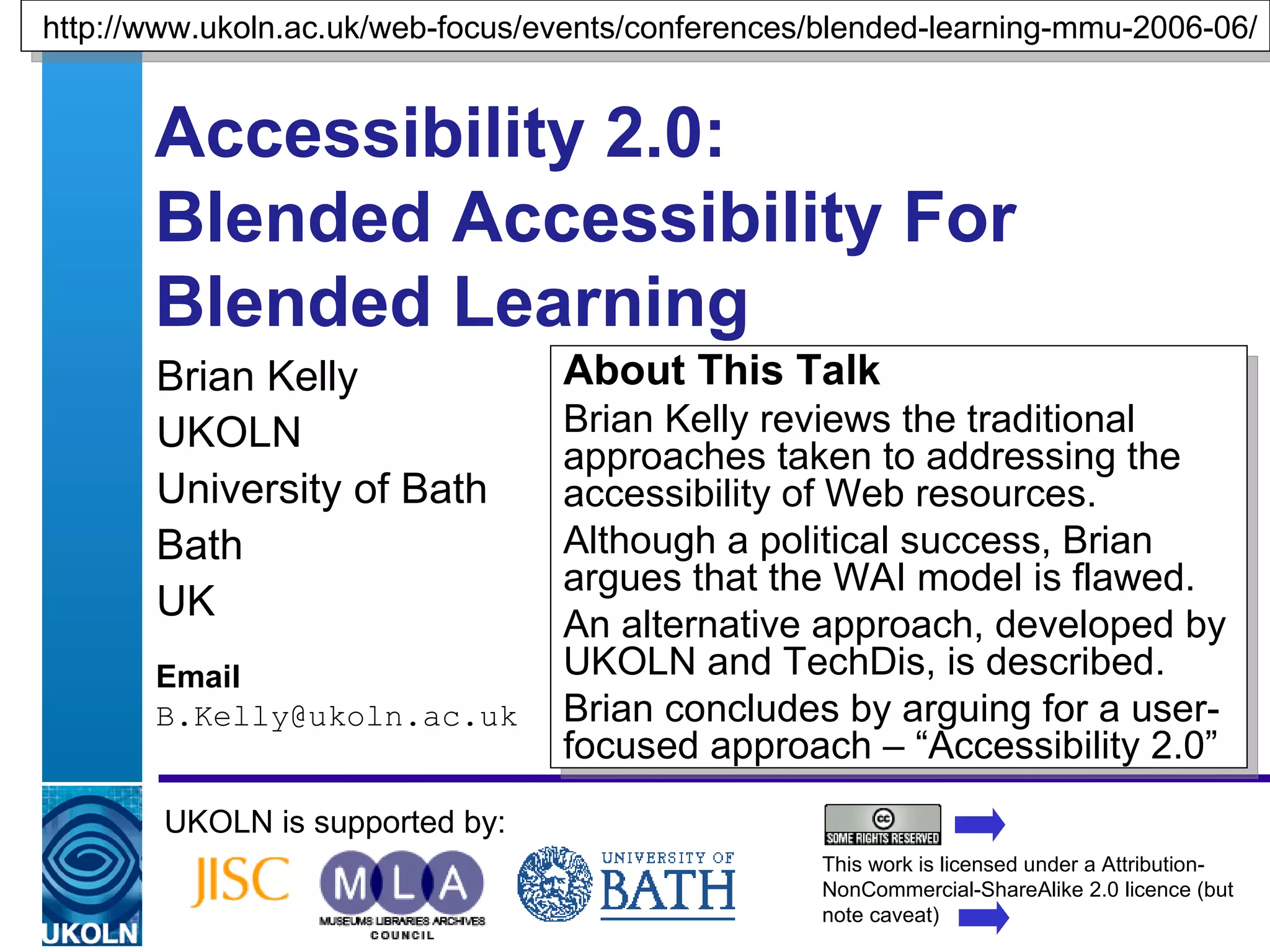 Brian Kelly discusses the limitations of the Web Accessibility Initiative (WAI) model for web resources accessibility and advocates for a user-centered alternative called 'Accessibility 2.0.' He proposes a holistic approach to e-learning accessibility that prioritizes user experience and contextual factors, while criticizing the rigid framework of existing guidelines. The document emphasizes the need for diverse solutions that accommodate different learning styles and abilities, rather than a simplistic compliance checklist.