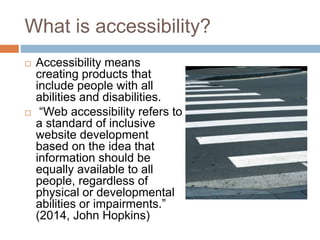 This document discusses accessibility and its importance in education. It defines accessibility as creating inclusive products for people with all abilities and disabilities. The Web Content Accessibility Guidelines (WCAG 2.0) were developed to ensure websites are accessible. Laws like the Americans with Disabilities Act and the Individuals with Disabilities Education Act require equal access to education. Assistive technologies help students with disabilities access information in the classroom. Examples include devices that magnify text or serve as communicators.