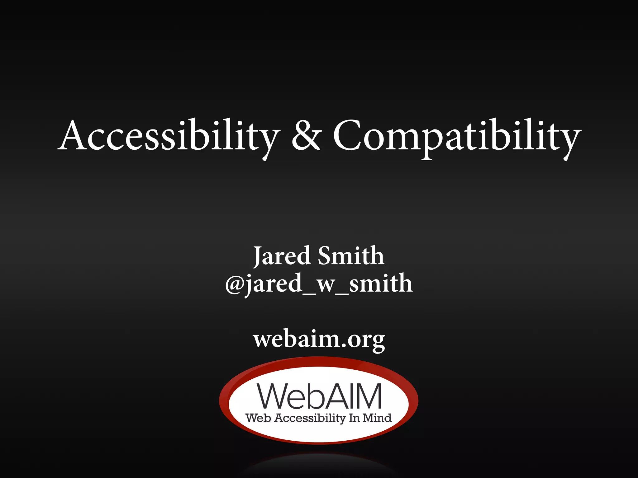 This document discusses various topics relating to accessibility and compatibility of websites for people using assistive technologies. It provides tips on how to make forms, images, links, and other elements accessible. Key recommendations include using ARIA attributes to make interfaces accessible, providing text alternatives for non-text content, ensuring full keyboard and screen reader support, and avoiding any changes that could disrupt a screen reader user's experience of a page. The overall focus is on compatibility beyond just technical standards compliance.