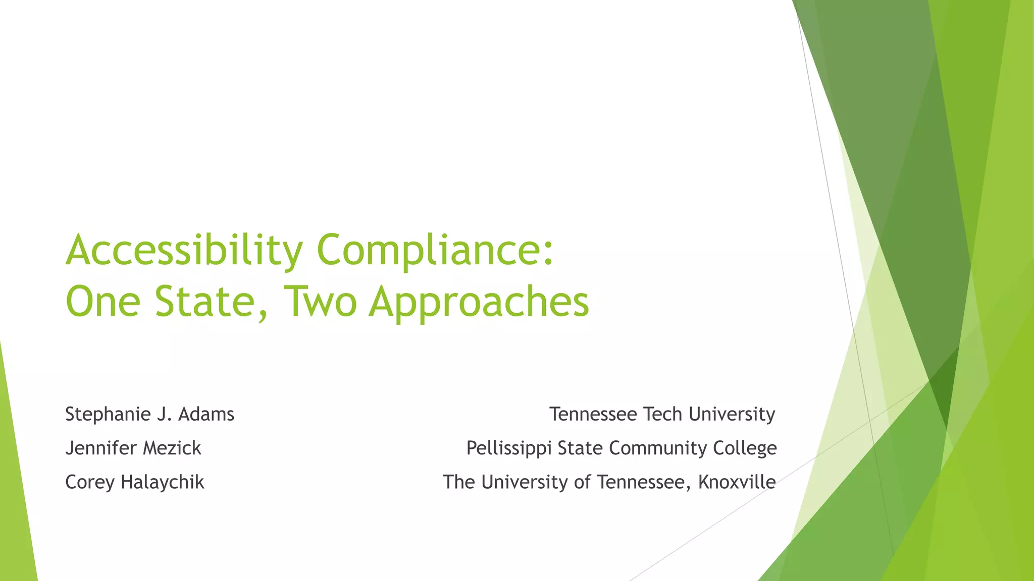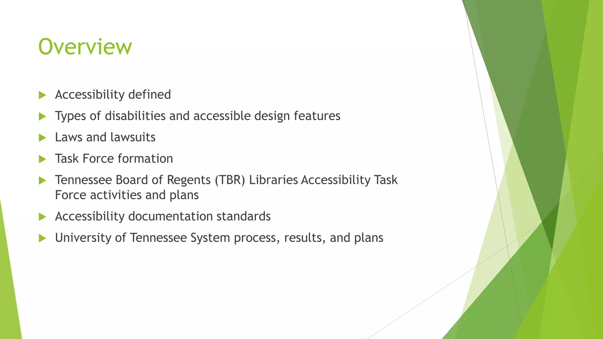 The document discusses accessibility compliance in Tennessee's higher education system, highlighting two main approaches taken by state institutions. It covers definitions of accessibility, types of disabilities, relevant laws, the formation of task forces, and activities aimed at enhancing accessibility in libraries and educational materials. Additionally, it outlines complaints and legal actions related to accessibility issues in higher education and the roles of various institutions in promoting compliance.