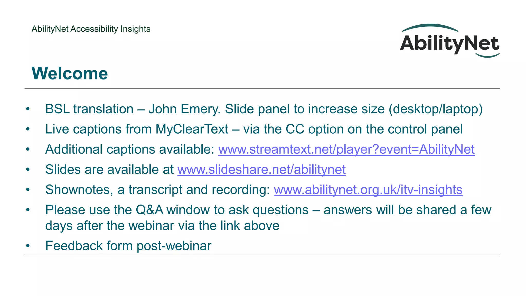 The document provides an overview of the AbilityNet Accessibility Insights episode 4, featuring discussions on accessibility with David Padmore and Matt Simpson. It includes information on accessibility training courses, webinars, and resources available through AbilityNet, such as live captions and additional content for viewers. It also highlights the TechShare Pro conference as a major event in the accessibility field.