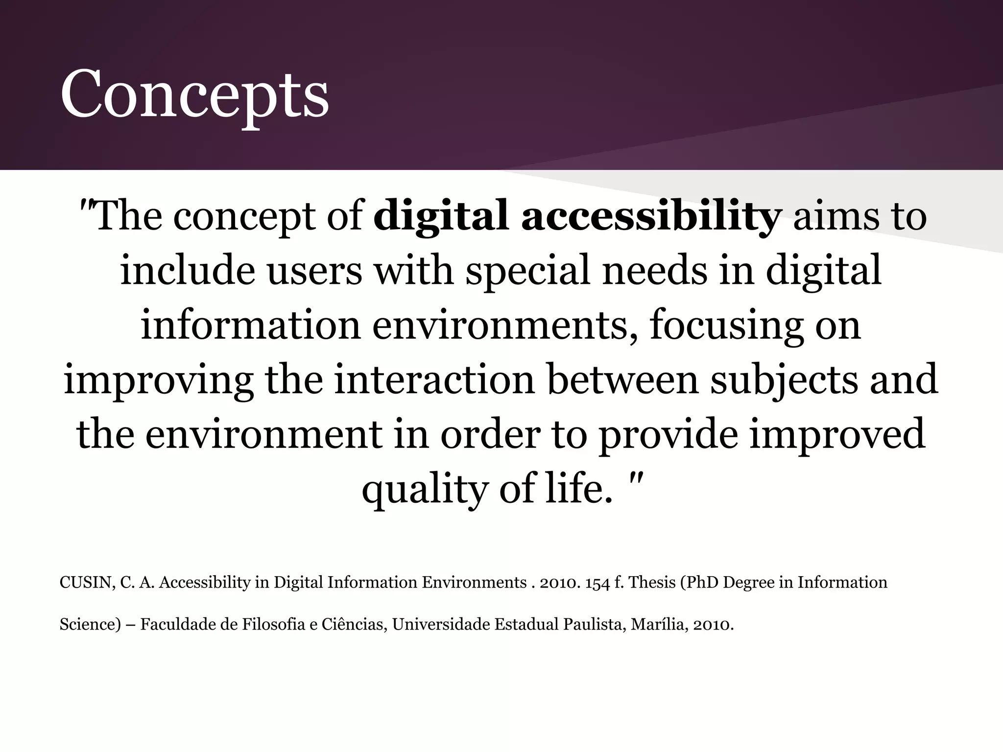 The document discusses concepts and resources related to digital accessibility. It defines digital accessibility as aiming to include users with special needs by improving interaction between subjects and digital environments to enhance quality of life. It provides examples of HTML semantic tags, CSS properties, JavaScript events, and guidelines, tools, and resources to evaluate and improve accessibility.