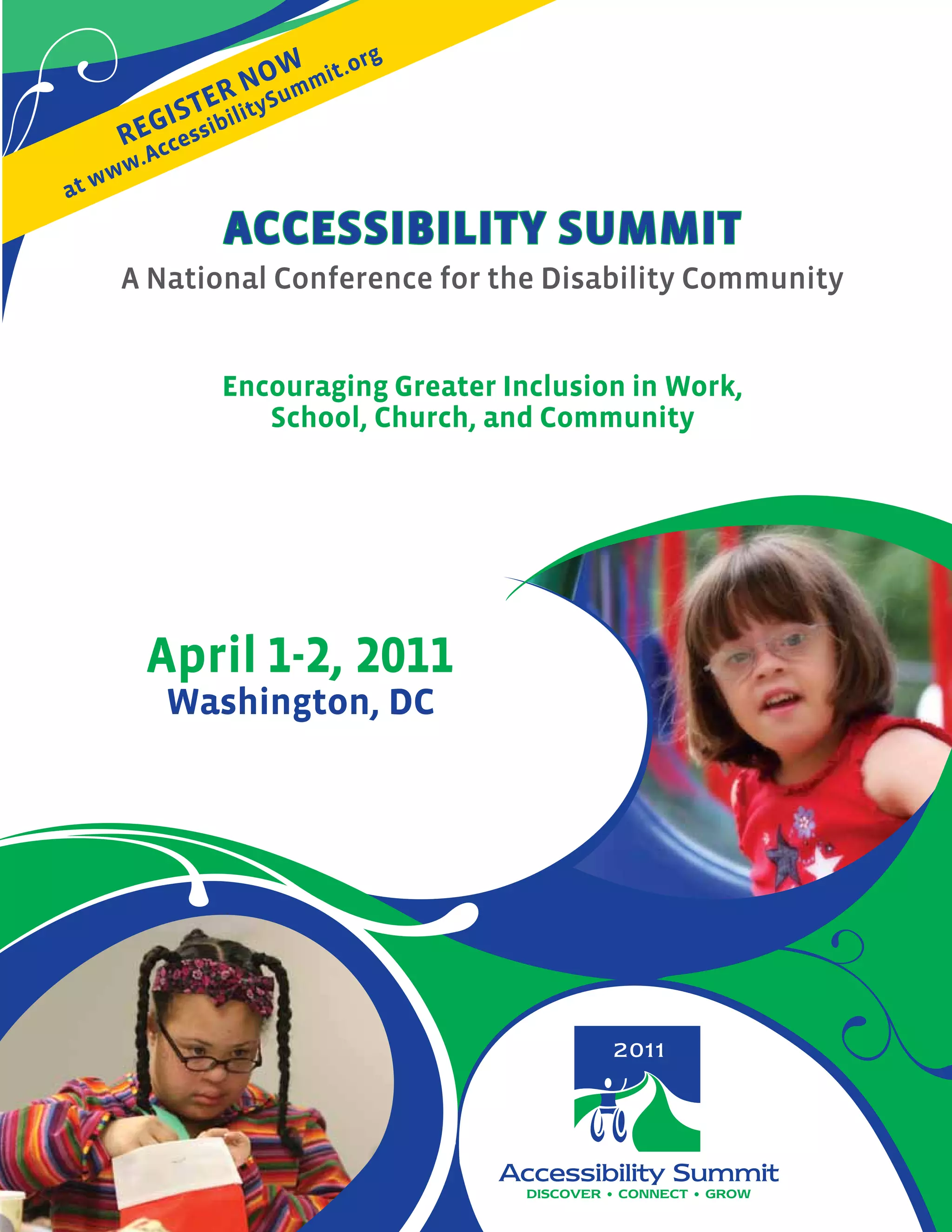 The 2011 Accessibility Summit will be held on April 1-2 at McLean Bible Church in Vienna, VA. The summit will feature 30 disability-related workshops, keynote speeches from Jon Sheptock and Dr. Temple Grandin, and over 60 exhibits. The goal is to encourage greater inclusion for those with disabilities in work, school, church, and community. Attendees will learn strategies and resources to make a difference in their homes and organizations. It is an opportunity to connect with others passionate about supporting the disability community.