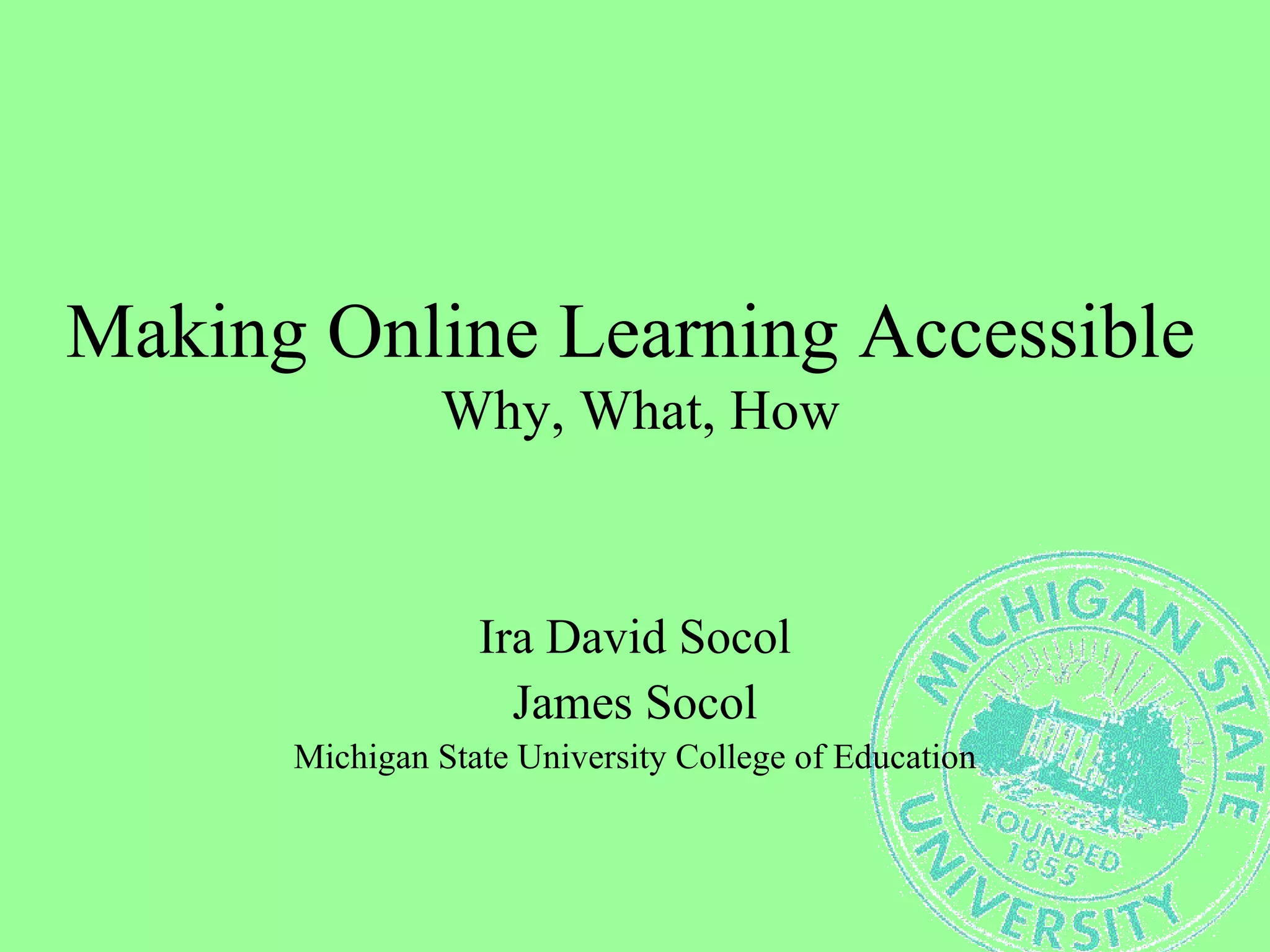 The document discusses making online learning accessible by providing information on text-to-speech, creating accessible documents and presentations, handling computers and mobile devices in the classroom, and giving feedback to students. It covers topics like adding accessibility features to software, converting documents to accessible formats, designing online environments for accessibility, and evaluating websites for accessibility standards compliance. Resources are provided on a variety of tools and guidelines for creating accessible online content, documents, and classroom experiences.