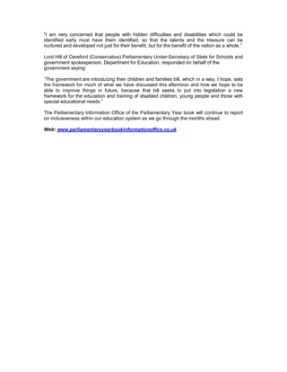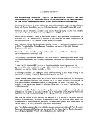 Members of the House of Lords debated accessible education for individuals with hidden disabilities, such as dyslexia and autism, emphasizing the need for early identification and tailored educational approaches. Key speakers, including Lord Addington and Baroness Browning, highlighted the importance of recognizing individual needs and offering appropriate support. The government plans to introduce a Children and Families Bill aimed at improving education and training for disabled children and young people.