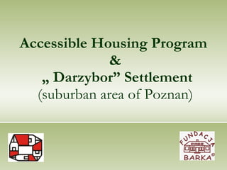 The document summarizes Barka Foundation's accessible housing program and Darzybor Settlement project in Poznan, Poland. It provides background on Poland's housing crisis and Barka's previous housing projects. It then describes plans for the Darzybor Settlement, which will provide housing for around 400-500 socially excluded people. The settlement will be developed in stages, with the first 32 homes built by 2005 to house the first families.
