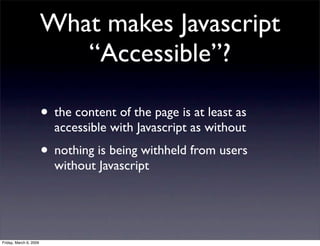 This document discusses making JavaScript accessible. It emphasizes that accessibility starts with accessible markup and ensuring the page works without JavaScript. JavaScript should enhance usability and accessibility, not reduce it. Frameworks can help by unifying APIs, providing ready components, and extensive testing for stability, usability and accessibility including with screen readers. The document provides examples of accessible JavaScript implementations and frameworks.