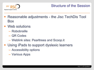 The document discusses using iPads to support inclusive learning. It provides an overview of the Jisc TechDis Toolbox for reasonable adjustments, web solutions like Robobraille and QR codes, and using the accessibility features and apps on iPads to support learners with dyslexia. The session structure, presenters, and links to further resources are also mentioned.