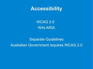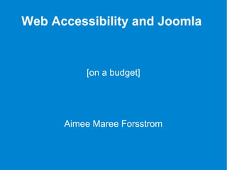 The document discusses web accessibility using Joomla, emphasizing the importance of adhering to WCAG 2.0 standards while maintaining budget constraints. It highlights key practices such as using alt tags for images, selecting meaningful link texts, ensuring proper color contrast, and structuring headings correctly. Additionally, it points out the limitations of third-party accessibility extensions and encourages developers to consider accessibility from the beginning of the design process.