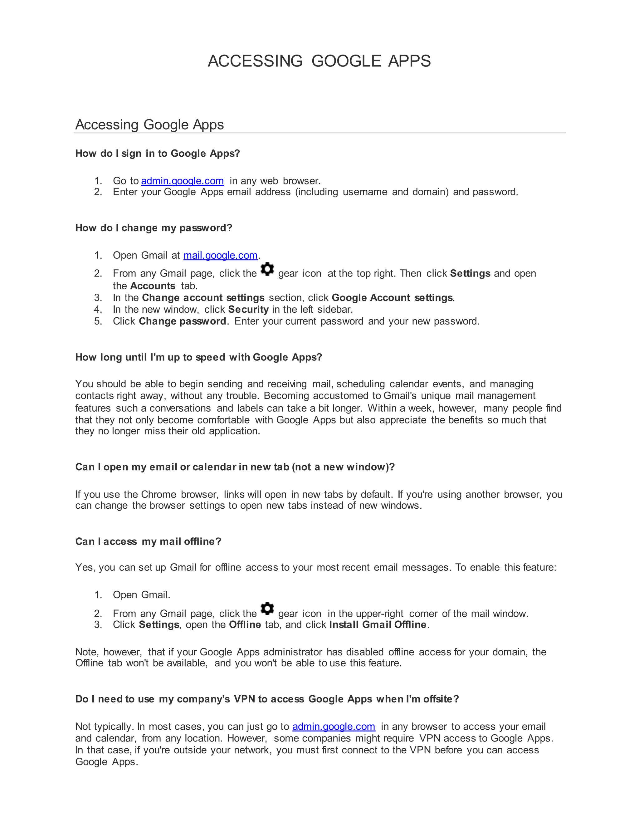 The document provides answers to frequently asked questions about accessing and using Google Apps. It discusses how to sign in, change passwords, access email and calendars offline, and use Google Apps from other programs. It also covers browser and language support for Google Apps. Key details include signing into admin.google.com with your Google Apps email and password, enabling offline access in Gmail settings, and using Outlook or IMAP/POP clients to access Google Apps from other email programs.