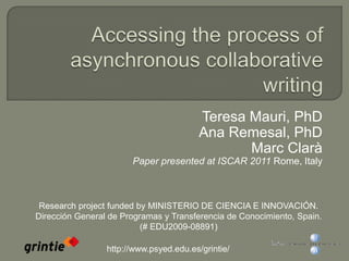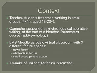 The document discusses a research study on asynchronous collaborative writing among teacher-student groups, focusing on the interplay between task structure and social participation. It utilizes a case study approach with various methodologies, including analysis of written interactions and self-reports, to identify critical events that influence writing strategies. The findings highlight varying strategies of text composition among groups and link instructional circumstances to changes in approach.