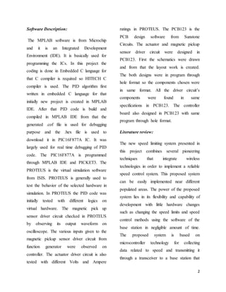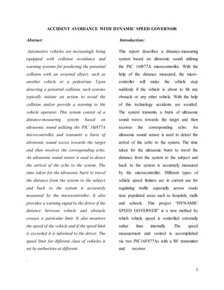 This document describes a collision avoidance system using ultrasonic sensors and a microcontroller. The system works by transmitting ultrasonic pulses and measuring the time it takes for the echo to return, allowing it to calculate the distance to any obstacles. If an obstacle gets too close, the system can activate emergency braking. It also monitors vehicle speed and alerts the driver if the speed limit is exceeded. The system aims to help avoid accidents by detecting obstacles and enforcing speed limits.