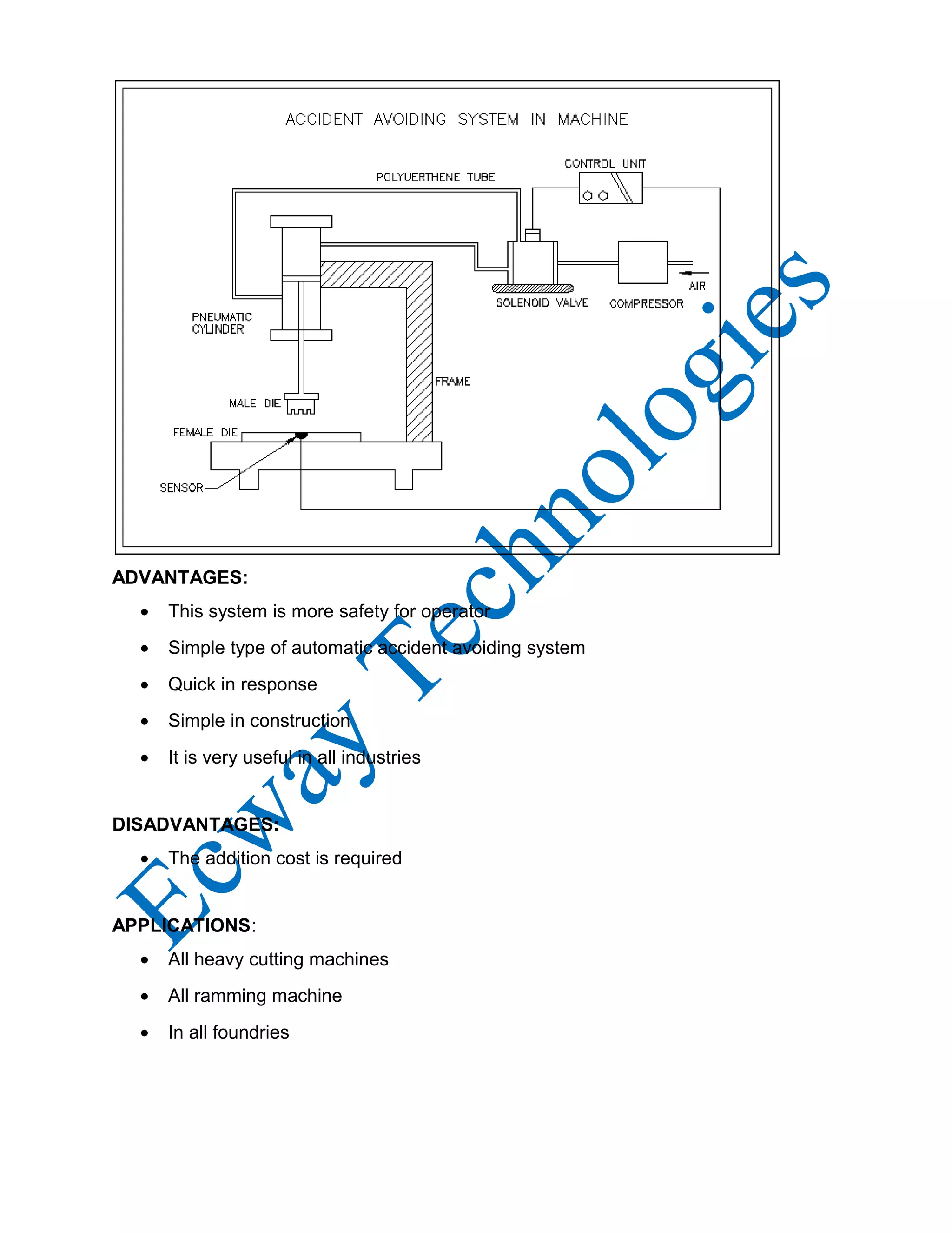 This document describes a project to develop an accident avoidance system for ramming machines. The system uses an IR transmitter and receiver to detect if an object gets too close to the machine, which will then trip a relay to stop the machine and sound an alarm. A vibration sensor and earth fault detector are also used to monitor vibrations and faults that could indicate issues. The system aims to make the machines safer for operators through quick response times and simple construction, while reducing accidents during maintenance as well. Its applications include heavy cutting machines, ramming machines, and foundries.