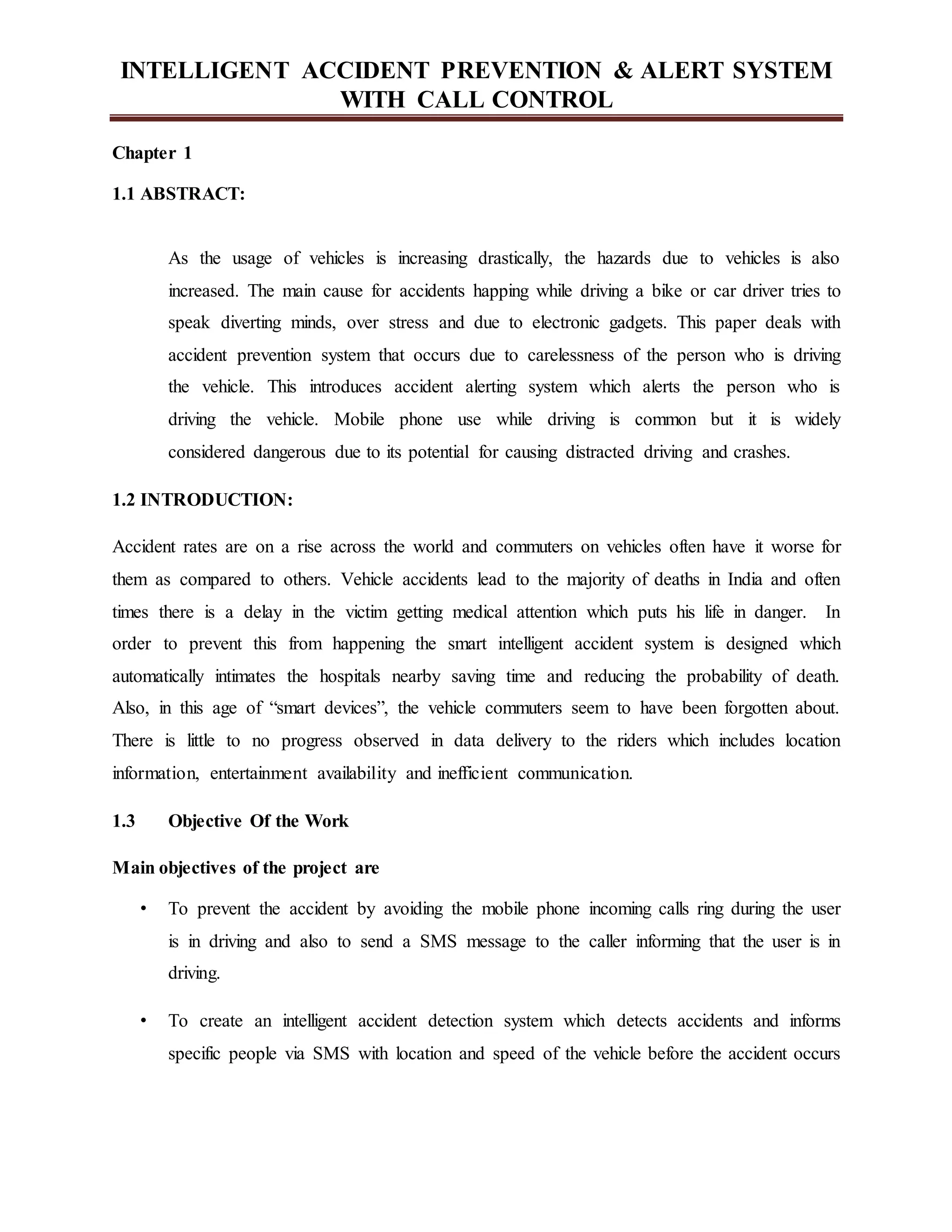 The document presents an intelligent accident prevention and alert system designed to reduce vehicle accidents, primarily caused by distractions such as mobile phone usage while driving. It outlines the system's objectives to eliminate distractions from incoming calls and to automatically notify emergency contacts with location data in the event of an accident. Additionally, it provides an overview of the Android platform's capabilities, emphasizing features that support the development of mobile applications aimed at enhancing vehicle safety and communication.