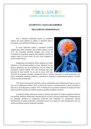 Accidentul vascular cerebral (AVC) apare când circulația sângelui către creier este întreruptă, provocând simptome grave precum paralizie și tulburări de vorbire. AVC afectează persoane de toate vârstele, fiind stimulat de factori precum hipertensiunea și consumul excesiv de droguri sau medicamente. Medicina tradițională propune tratamente alternative, inclusiv acupunctura și remedii pe bază de plante, pentru recuperarea pacienților.