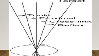 This document discusses different types of convergence in the eyes. It defines accommodative convergence as convergence that occurs during accommodation or when the eyes receive an impulse to accommodate. The near reflex triad is defined as the reflex of the eyes to focus on a near object, consisting of accommodation, convergence, and miosis. It also discusses the AC/A ratio, which is a measurement of accommodative convergence, and how abnormalities in this ratio can cause different types of strabismus. Proximal convergence is induced by the proximity of an object rather than its optical properties, and has an inverse relationship with changes in fixation distance.