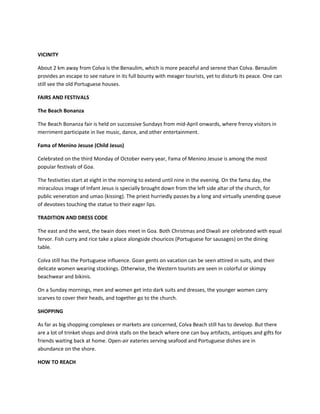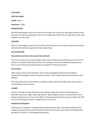Colva Beach is Goa's longest beach, stretching 20 km along the Arabian Sea. It is located 39 km from Panaji in south Goa. Popular attractions include the Church of Nossa Senhora de Merces, known for its annual Child Jesus festival. The beach offers a scenic view of fishermen's boats and is a romantic spot in the evenings. Development has increased over the years, though the area still retains Portuguese influences in its culture and architecture.