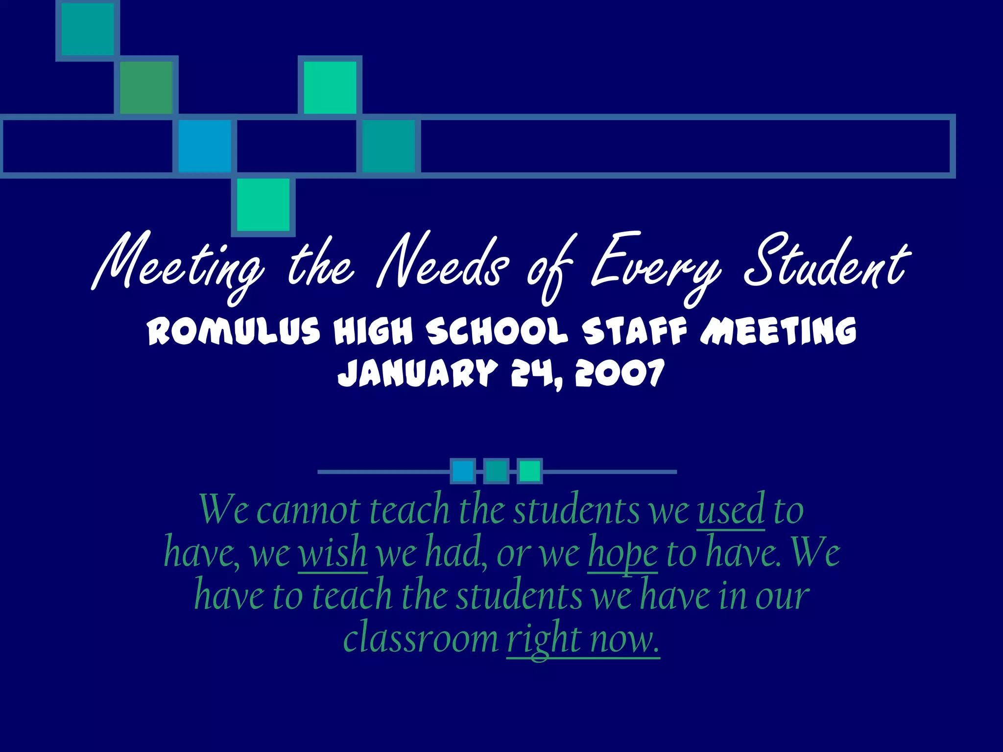 The document summarizes the key points from a staff meeting about meeting the needs of every student. It discusses the importance of engaging students within the first 18 seconds, changing learning states every 7-10 minutes, and allowing students to make personal meaning every 20-30 minutes. It also covers addressing the needs of students with disabilities, providing accommodations in content delivery and assessments, developing strong study skills, and adapting lessons and materials to meet individual student needs and goals. The overall message is that teachers must teach the specific students they have right now and find ways to inspire all students.