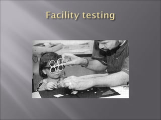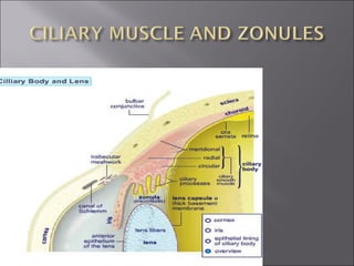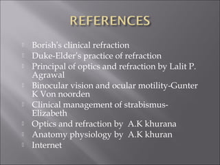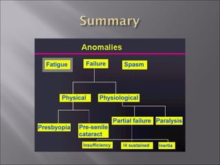 This document discusses accommodation and presbyopia. It begins by defining accommodation as the process by which the eye focuses on near objects. It then describes accommodation anatomy and the ranges and variation of accommodation with age. Presbyopia is introduced as a normal age-related condition where accommodation decreases. Theories of presbyopia are presented along with treatment options like glasses and contact lenses. Accommodative disorders like spasm and insufficiency are also summarized.