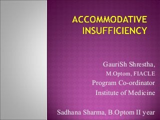This document discusses accommodative insufficiency, including its definition, signs and symptoms, assessment methods, and management approaches. Accommodative insufficiency is characterized by an inability to focus or sustain focus at near due to an insufficient amplitude of accommodation based on age-expected norms. Evaluation involves assessing near point of accommodation and determining amplitude of accommodation. Management includes prescribing reading glasses to reduce accommodative demand, vision therapy using techniques like flippers and Hart charts to strengthen accommodation, and occasionally multifocal lenses. The goal of treatment is to improve the ability to make rapid accommodative responses without fatigue.