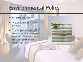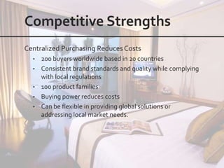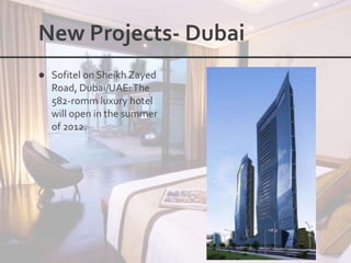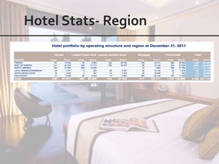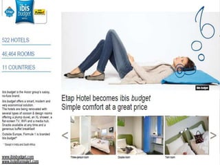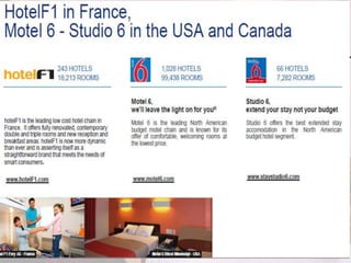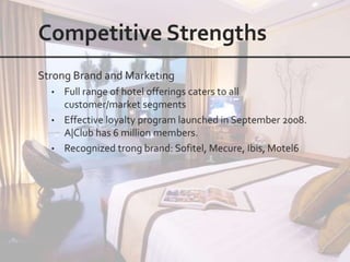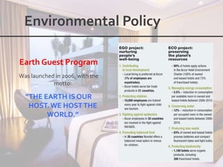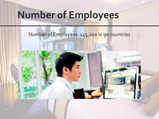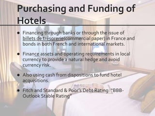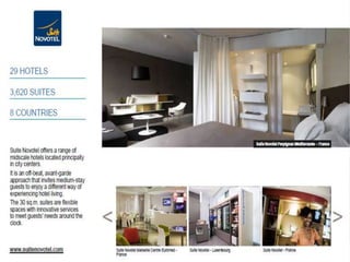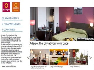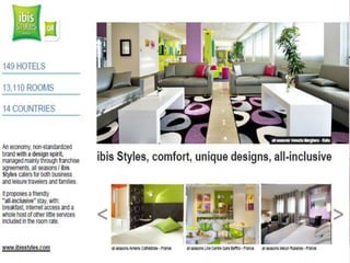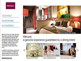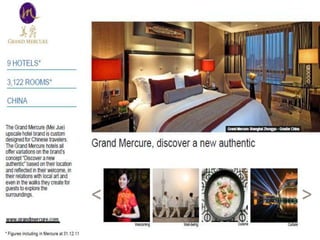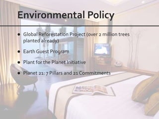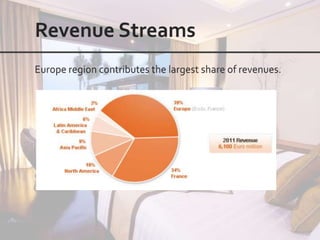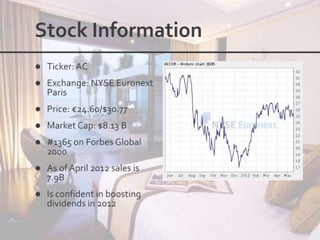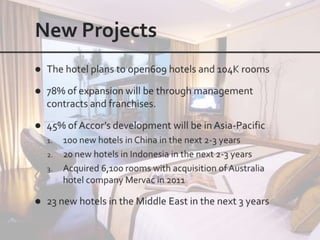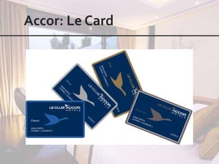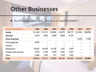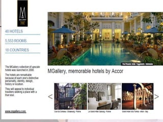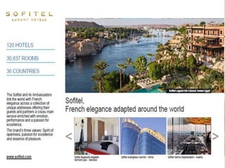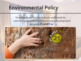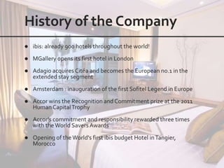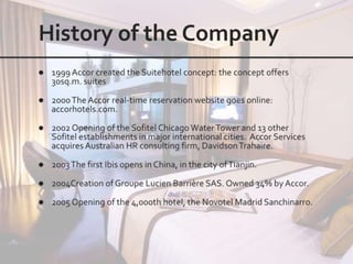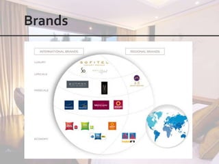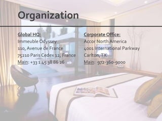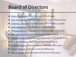 This document outlines the leadership and board of directors of Accor, an international hospitality group. It then lists the company's hotel brands, properties, partnerships, sponsorships, and in-hotel offerings. Accor has over 5,000 properties globally across 110 countries. The company is committed to sustainability and corporate social responsibility, supporting various charitable organizations worldwide.