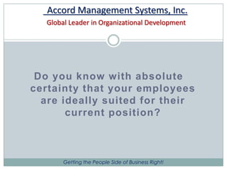 Accord Management Systems, Inc. is a premier organizational development and behavioral consultancy that helps companies better manage their employees. They provide leadership development programs, employee assessments to determine job fit, and engagement surveys. Their services are designed to close the gaps between job requirements and employees' skills and between companies' current and desired business performance. Accord has over 15 years of experience helping clients achieve their goals by getting the right people in the right roles. Their integrated approach provides assessments, training, support, and action plans tailored to each client's unique needs.