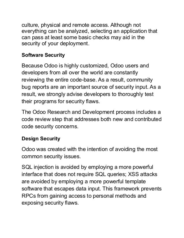 Odoo is recognized by OWASP as a highly secure ERP platform due to its proactive approach to security, including community code reviews, third-party vulnerability audits, and built-in protections against common threats like SQL injection and cross-site scripting. The platform's architecture and security measures, such as access control layers and encryption practices, are designed to prevent unauthorized access and safeguard user data. Odoo's commitment to security is reinforced by ongoing collaboration with independent security researchers and adherence to industry standards.