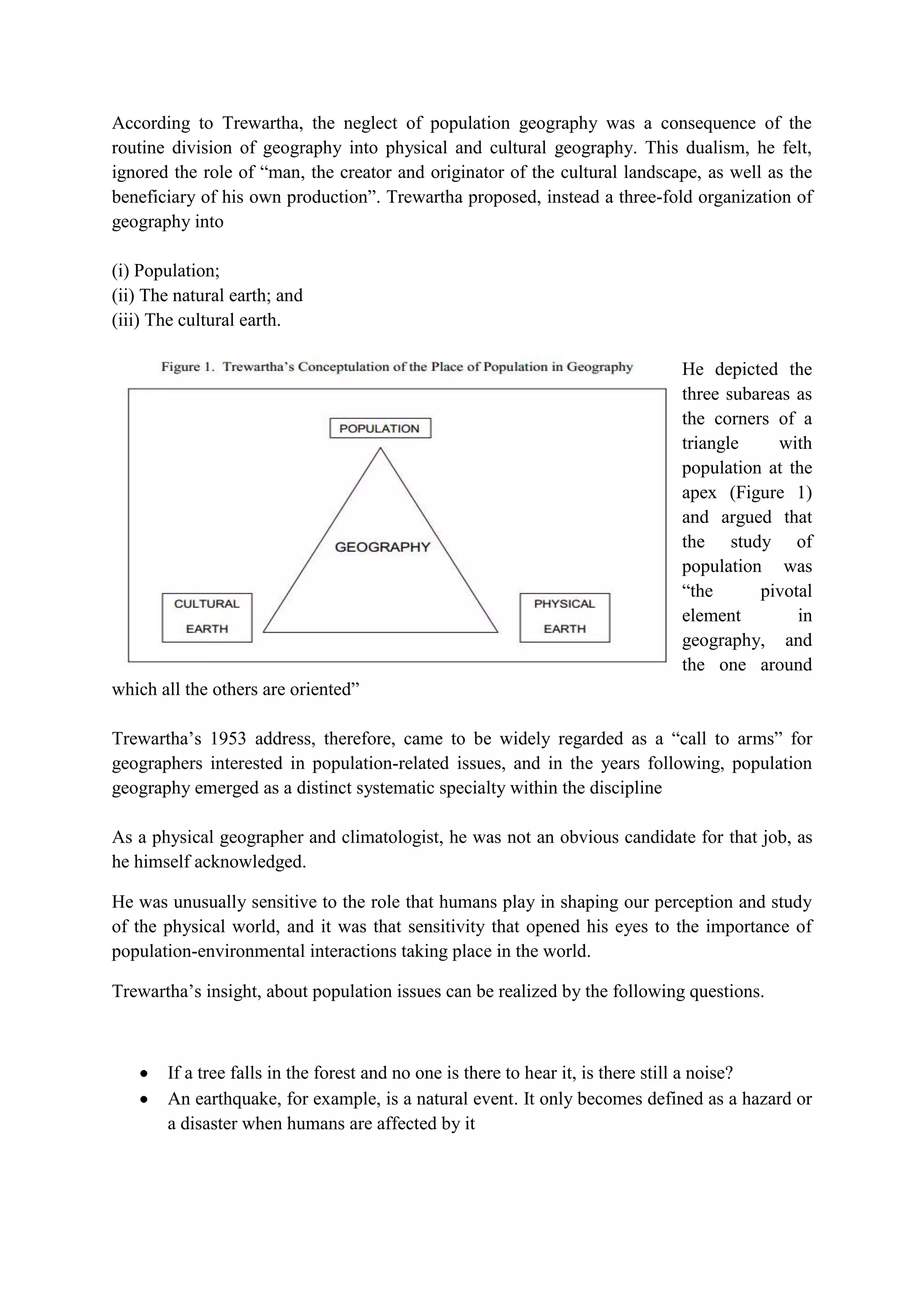 Trewartha criticized the neglect of population geography in favor of the dualistic division of geography and proposed a three-fold organization emphasizing population's central role. He argued that population is the pivotal element around which all geographical studies revolve, thus highlighting the significance of population-environment interactions. His perspective established population geography as a distinct field and underscored the importance of human impacts on the physical world.