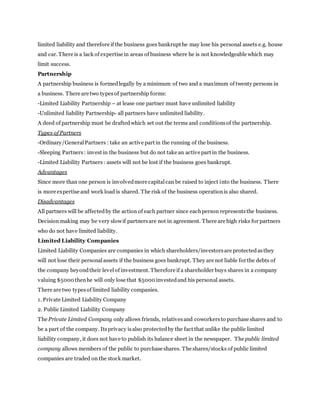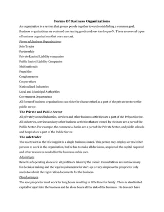There are several forms of business organizations that vary in ownership structure and legal requirements. These include sole proprietorships, partnerships, limited liability companies, multinational corporations, franchises, conglomerates, cooperatives, nationalized industries, and government departments. Limited liability companies provide protection to shareholders so they are not personally liable for business debts or bankruptcy. Multinational corporations operate across international borders but may exploit local workers. Cooperatives are owned by members who can obtain goods and services at lower costs.