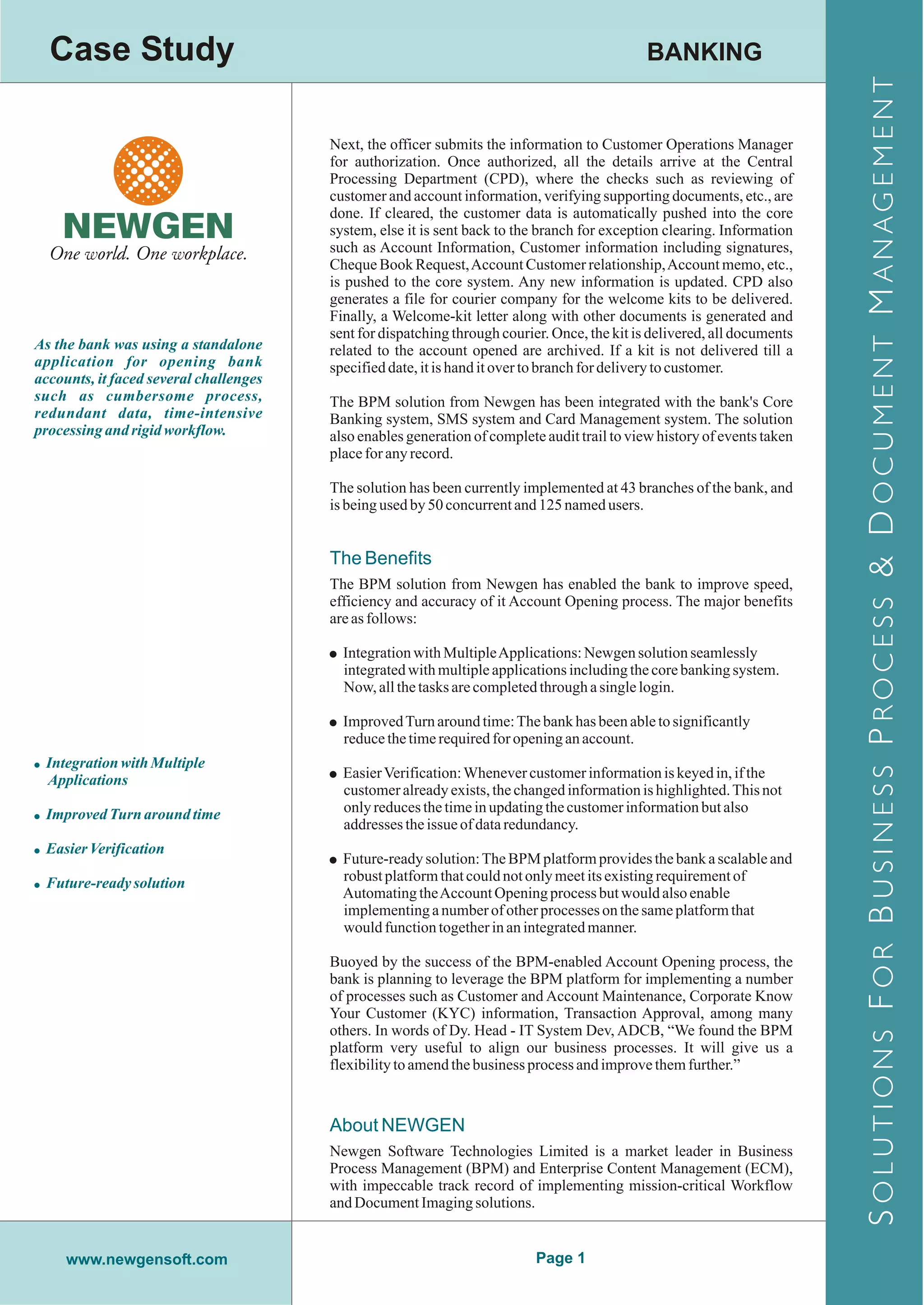 As the bank was using a standalone application for opening bank accounts, it faced several challenges such as a cumbersome process, redundant data, time-intensive processing and a rigid workflow. Newgen provided a BPM-enabled workflow platform that integrated with the bank's core banking system and other applications. This streamlined the account opening process, improved turnaround times, enabled easier verification of customer data, and provided a future-ready solution. The benefits have led the bank to plan implementing other processes on the same platform.