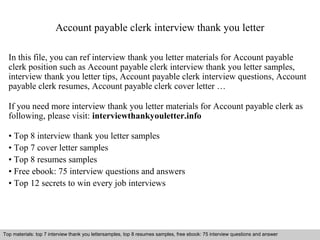 The document provides resources and tips for writing thank you letters after interviews for an account payable clerk position, including sample letters, interview questions, and resume materials. It emphasizes the importance of sending thank you letters promptly, personalizing them for each interviewer, and making a positive impression to stand out. Additional resources for job seekers, including ebooks and samples, are also mentioned.