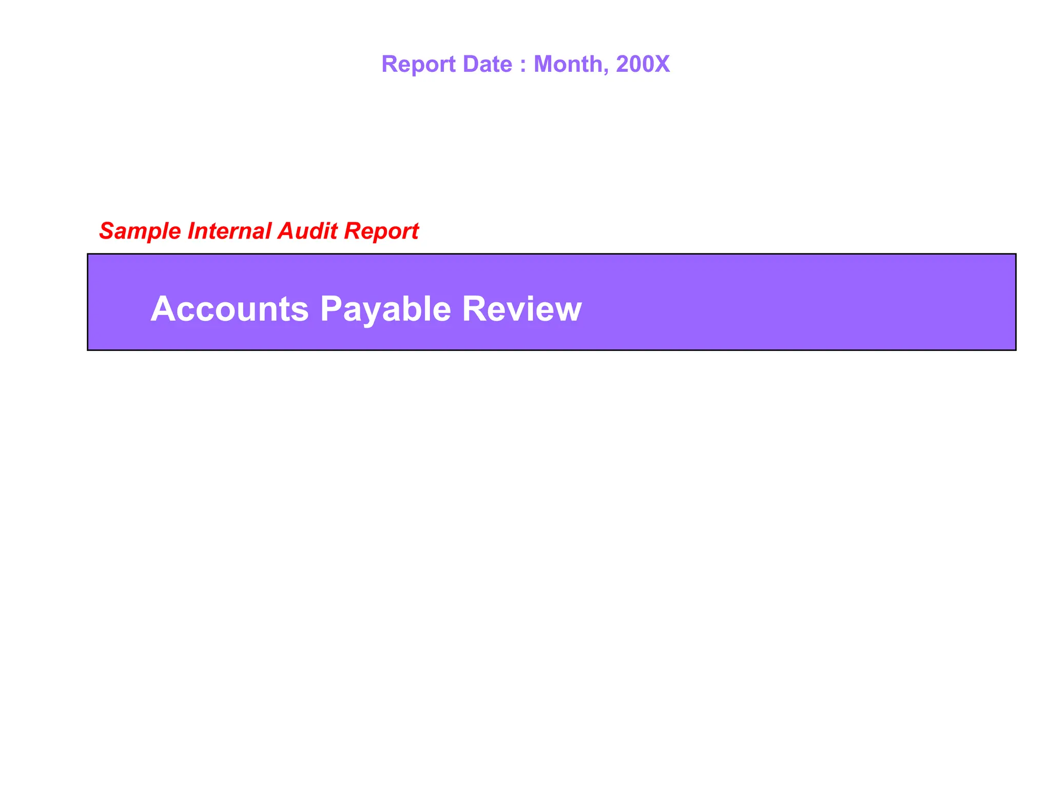 Internal audit reviewed the Accounts Payable function in (Month) of 200X. The objectives of this review were to obtain an understanding of