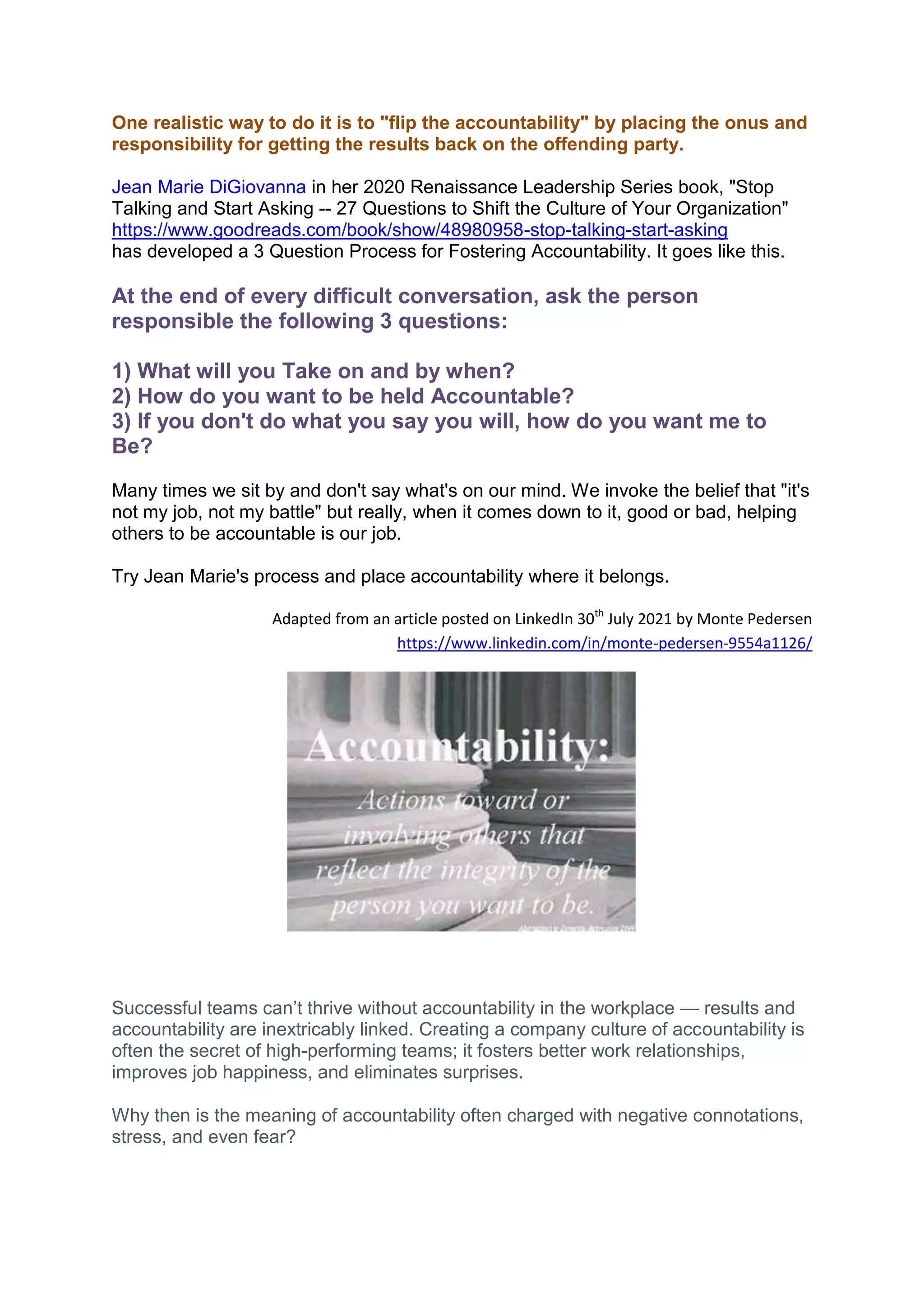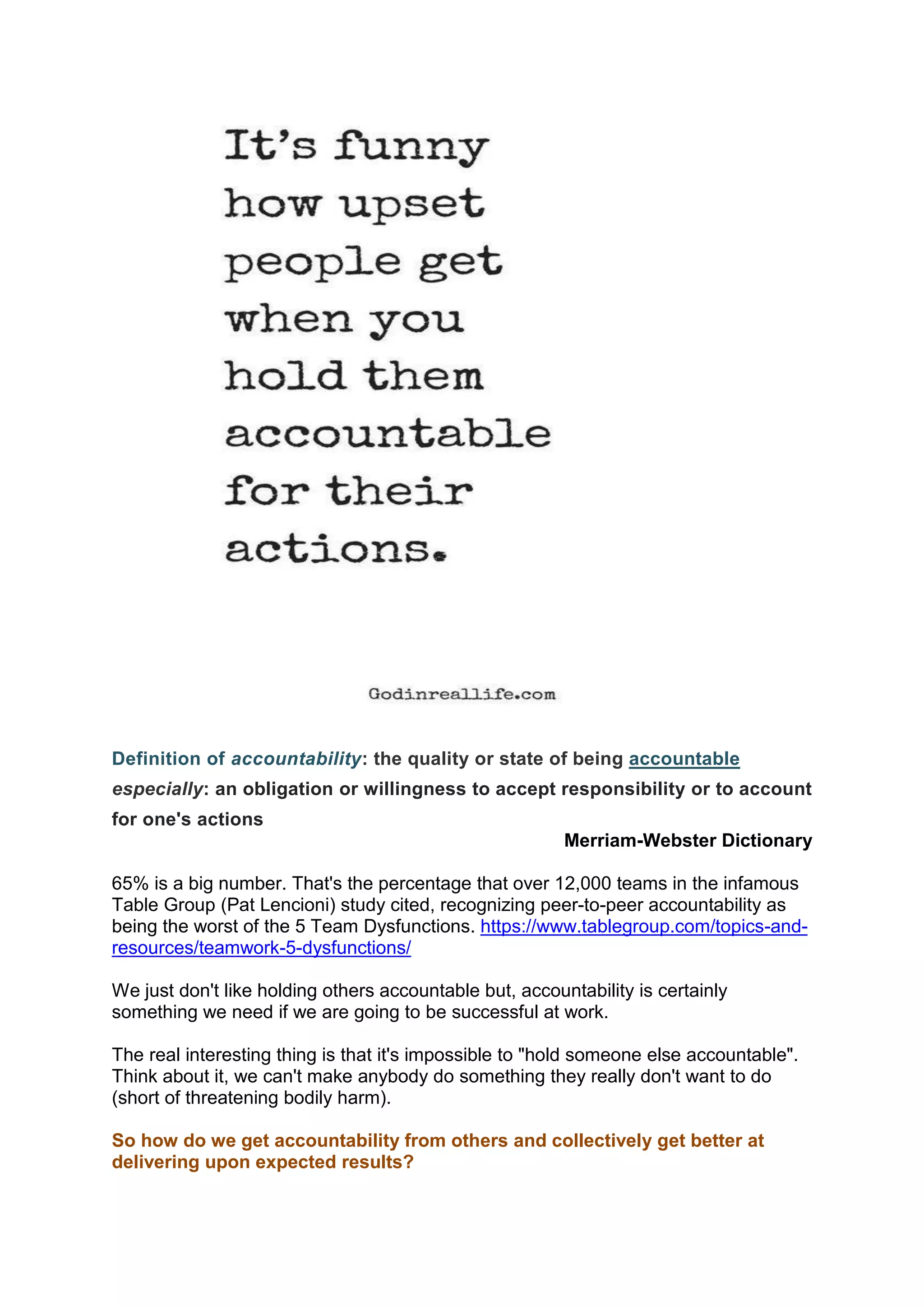 The document discusses accountability in the workplace and provides strategies for fostering a culture of accountability. It notes that accountability is often seen negatively but defines it positively as accepting responsibility for one's actions. It recommends setting clear expectations, creating trust and psychological safety, and using the "Accountability Puzzle" which involves specific commitments, owners, dates, and transparency. Fostering accountability starts from leading by example and being willing to accept responsibility.