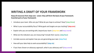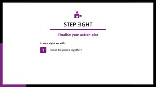 Step eight focuses on finalizing an accountability framework by integrating previous steps, defining roles, and setting milestones for stakeholders. It emphasizes the importance of careful planning, gathering feedback from stakeholders, and identifying resources needed for implementation. The document also outlines monitoring success and evaluation tools to track progress over the next five years, supported by the European Commission.