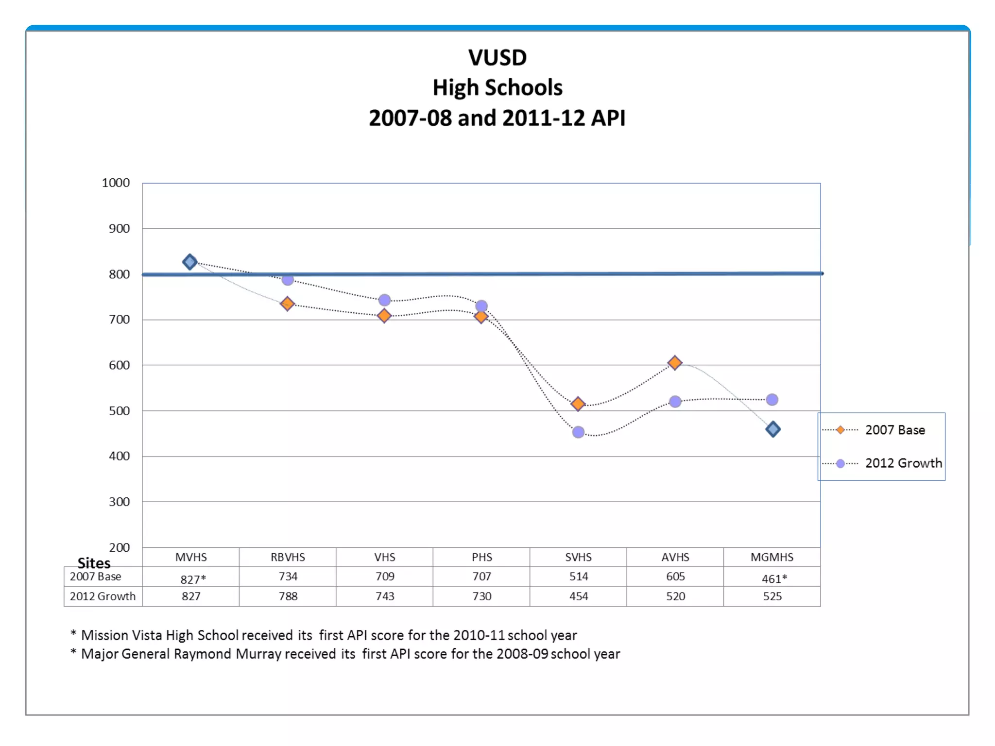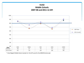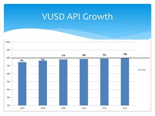 Vista Unified School District's 2011-12 Accountability Report shows that from 2007 to 2012, the API scores of VUSD elementary schools generally increased, with some schools such as CAS Center and EM Elementary increasing their API by over 75 points. The report also discusses VUSD's adequate yearly progress, snapshots of individual schools including Casita Elementary, Vista Magnet Middle School, and Vista High School, and contains a questions section.