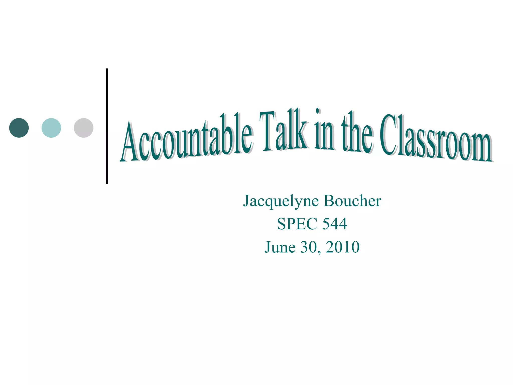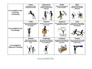 The document outlines different strategies for accountable talk in the classroom, including listening to others, summarizing previous statements, building on others' ideas, marking important points, verifying understanding, unpacking explanations, supporting arguments with evidence, linking ideas, defending positions, challenging statements, combining multiple perspectives, and predicting outcomes.