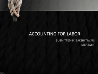 The document discusses accounting for labor costs. It defines labor costs as payments made to workers in exchange for their services, including wages and benefits. Labor is an important input for production that converts materials into finished goods. Proper planning, accounting, and control of labor is needed to minimize costs and maximize efficiency. The document outlines different types of labor costs, incentives for workers, methods for tracking labor usage, and factors that influence labor costs.