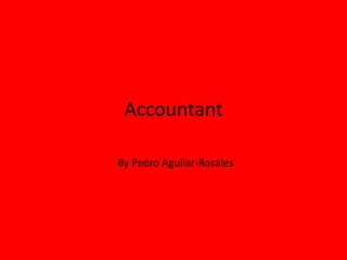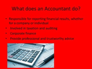 An accountant is responsible for reporting financial results, taxation, auditing, and providing professional financial advice. They work in offices, homes, and public accounting firms. Becoming an accountant requires obtaining a certified public accountant certification by passing a national exam and obtaining a bachelor's or master's degree in accounting. The average annual salary for an accountant ranges from $39,640 to $109,870, with a median of $61,690.