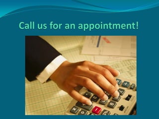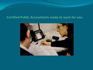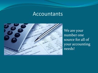 Accountants provides accounting services for both personal and business needs from tax issues to financial management. They are available Monday to Friday from 9am to 5pm in their downtown office and promise to handle any accounting need regardless of size or complexity.