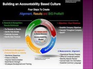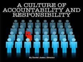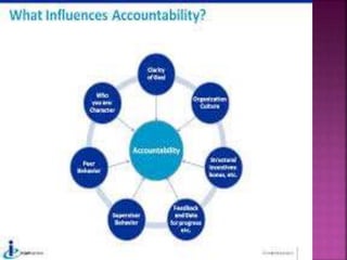 Accountability involves taking responsibility and being answerable for performance and results. It requires having a mindset of continuously seeking ways to achieve desired outcomes regardless of circumstances. To create accountability, organizations should define goals, sales figures, and expected results and make them clear to managers and employees. Individuals who take full accountability for their thoughts and actions can direct their own destiny.